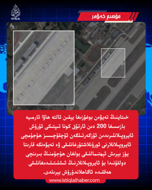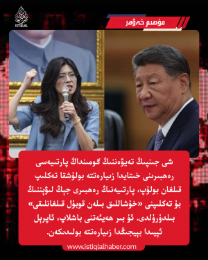 شەرقىي تۈركىستان بارلىق شەرقىي تۈركىستان خىتاي شەرقىي تۈركىستاندا خىتايچە ئىسىم قويۇلغان يەنە بىر ناھىيە تەسىس قىلدى شەرقىي تۈركىستان خىتاي ئىرقىي قىرغىنچىلىق ساياھىتى پويىزلىرىنى تېخىمۇ كۆپەيتىشنى پىلانلىدى شەرقىي تۈركىستان تالان-تاراج قىلىنغان يېڭى ئېنېرگىيە بايلىقى 300 مىليارد كىلوۋات سائەتتىن ئاشقان شەرقىي تۈركىستان شەرقىي تۈركىستاندا ئورگان «تەقدىم قىلغۇچى»لارنىڭ زور دەرىجىدە كۆپىيىشى دىققەت قوزغىدى شەرقىي تۈركىستان خىتاي بېيجىڭدا مەجبۇرىي ئەمگەك، تالان-تاراجنى كېڭەيتىشكە ئالاقىدار يىغىن ئاچتى شەرقىي تۈركىستان يىللىق دىنىي ئەركىنلىك دوكلاتىدا شەرقىي تۈركىستاندىكى دىنىي باستۇرۇش ئەيىبلەندى شەرقىي تۈركىستان خىتاي ئاققۇنلىرىنى شەرقىي تۈركىستانغا يەرلەشتۈرۈش جىنايىتى داۋاملاشماقتا شەرقىي تۈركىستان خىتاينىڭ غۇلجا بەيتۇللاھ مەسچىتىنى چېقىشنى پىلانلىغانلىقى ئاشكارىلاندى