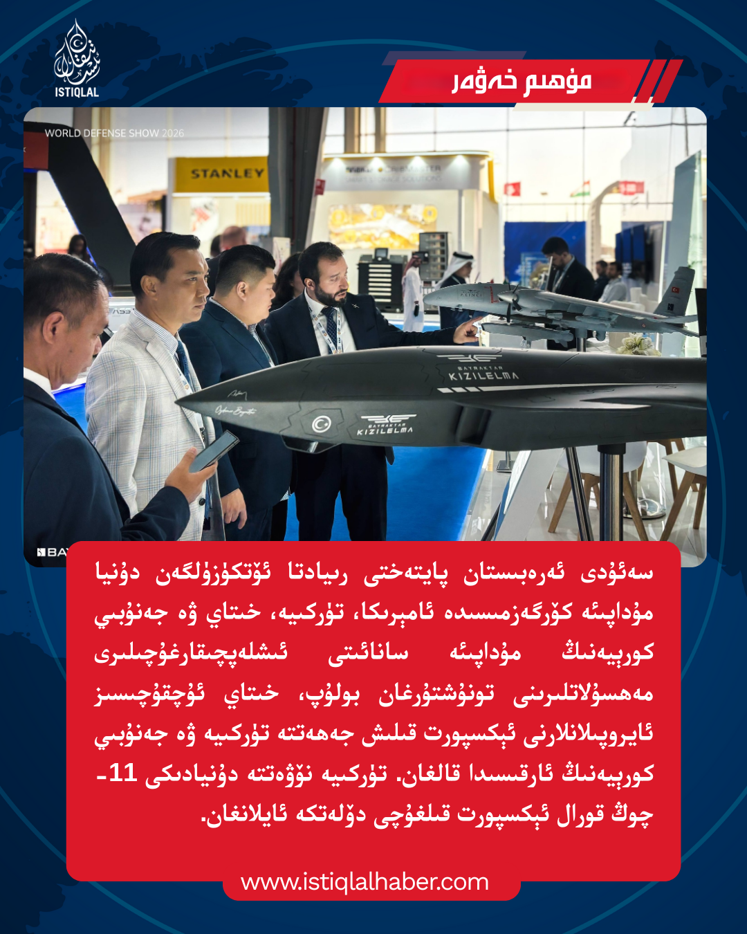 سەئۇدى ئەرەبىستان پايتەختى رىيادتا ئۆتكۈزۈلگەن دۇنيا مۇداپىئە كۆرگەزمىسىدە ئامېرىكا، تۈركىيە، خىتاي ۋە جەنۇبىي كورېيەنىڭ مۇداپىئە سانائىتى ئىشلەپچىقارغۇچىلىرى مەھسۇلاتلىرىنى تونۇشتۇرغان بولۇپ، خىتاي ئۇچقۇچىسىز ئايروپىلانلارنى ئېكسپورت قىلىش جەھەتتە تۈركىيە ۋە جەنۇبىي كورېيەنىڭ ئارقىسىدا قالغان. تۈركىيە نۆۋەتتە دۇنيادىكى 11-چوڭ قورال ئېكسپورت قىلغۇچى دۆلەتكە ئايلانغان.