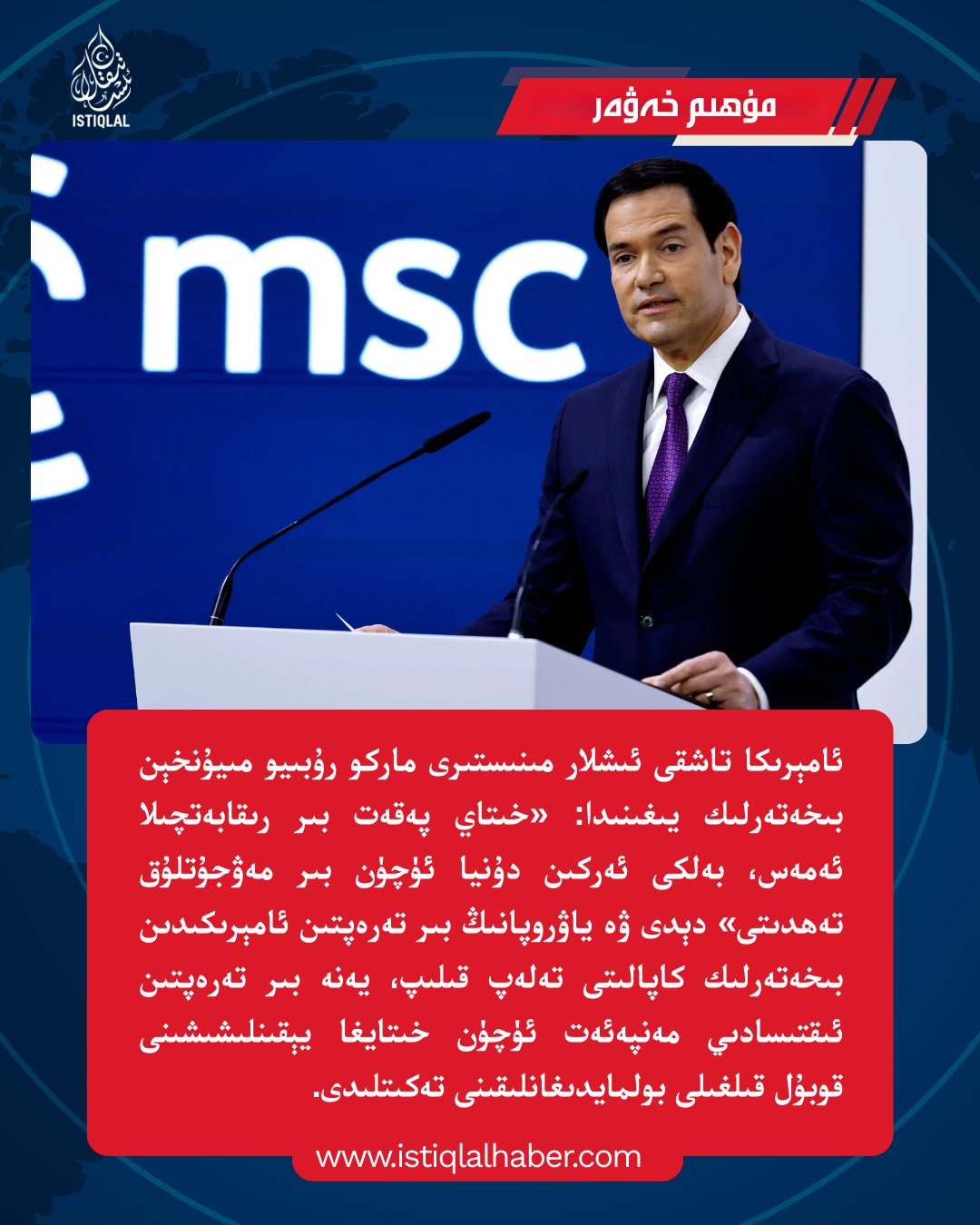 ئامېرىكا تاشقى ئىشلار مىنىستىرى ماركو رۇبىيو مىيۇنخېن بىخەتەرلىك يىغىنىدا: «خىتاي پەقەت بىر رىقابەتچىلا ئەمەس، بەلكى ئەركىن دۇنيا ئۈچۈن بىر مەۋجۇتلۇق تەھدىتى» دېدى ۋە ياۋروپانىڭ بىر تەرەپتىن ئامېرىكىدىن بىخەتەرلىك كاپالىتى تەلەپ قىلىپ، يەنە بىر تەرەپتىن ئىقتىسادىي مەنپەئەت ئۈچۈن خىتايغا يېقىنلىشىشىنى قوبۇل قىلغىلى بولمايدىغانلىقىنى تەكىتلىدى.