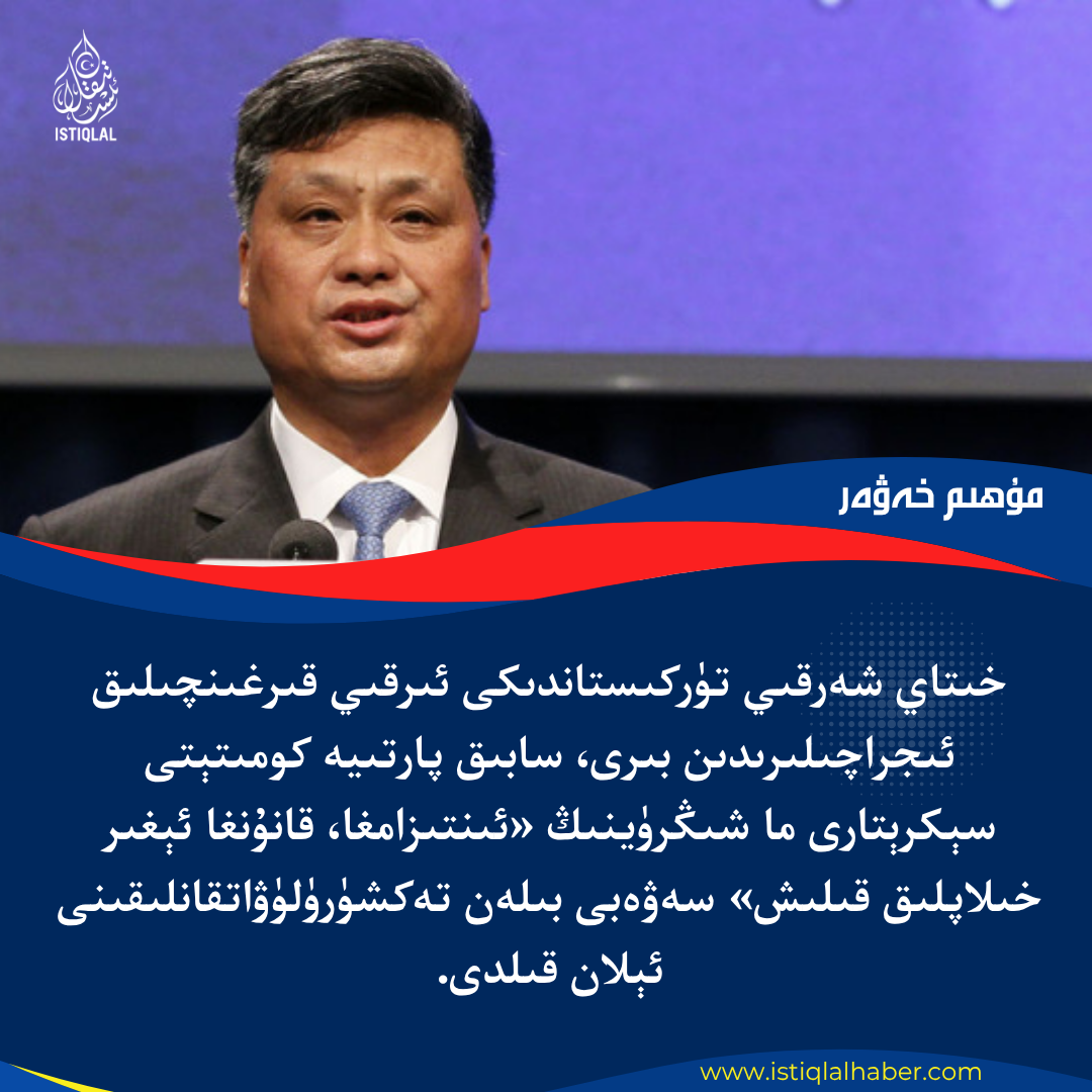 چاقماق خەەر ئىرقىي قىرغىنچىلىق ئىجراچىلىرىدىن بىرى ما شىڭرۈي تەكشۈرۈلۈشكە باشلىغان 2026-يىلى 4-ئاينىڭ 3-كۈنىدىكى مۇھىم خەۋەر 2026-يىلى 4-ئاينىڭ 3-كۈنىدىكى مۇھىم خەۋەر ئامېرىكا قازاقىستاننىڭ خىتايغا نېفىت يوللىشىغا رۇخسەت قىلدى 2026-يىلى 4-ئاينىڭ 1-كۈنىدىكى مۇھىم خەۋەر ياپونىيە بازىلىرىغا خىتاي قىرغاقلىرىنى قاپلىغان باشقۇرۇلىدىغان بومبا سەپلىدى 2026-يىلى 4-ئاينىڭ 1-كۈنىدىكى مۇھىم خەۋەر تۈركىيەدە «دوكتور نەبىجان تۇرسۇن ئوقۇش مۇكاپاتى» تەسىس قىلىندى كانادا باش مىنىستىرى ئۇيغۇر مەجبۇرىي ئەمگىكى ھەققىدە ئىپادە بىلدۈردى لاگېر شاھىتى قەلبىنۇر سىدىق «جاسارەت ئوبرازى» مۇكاپاتىغا ئېرىشتى