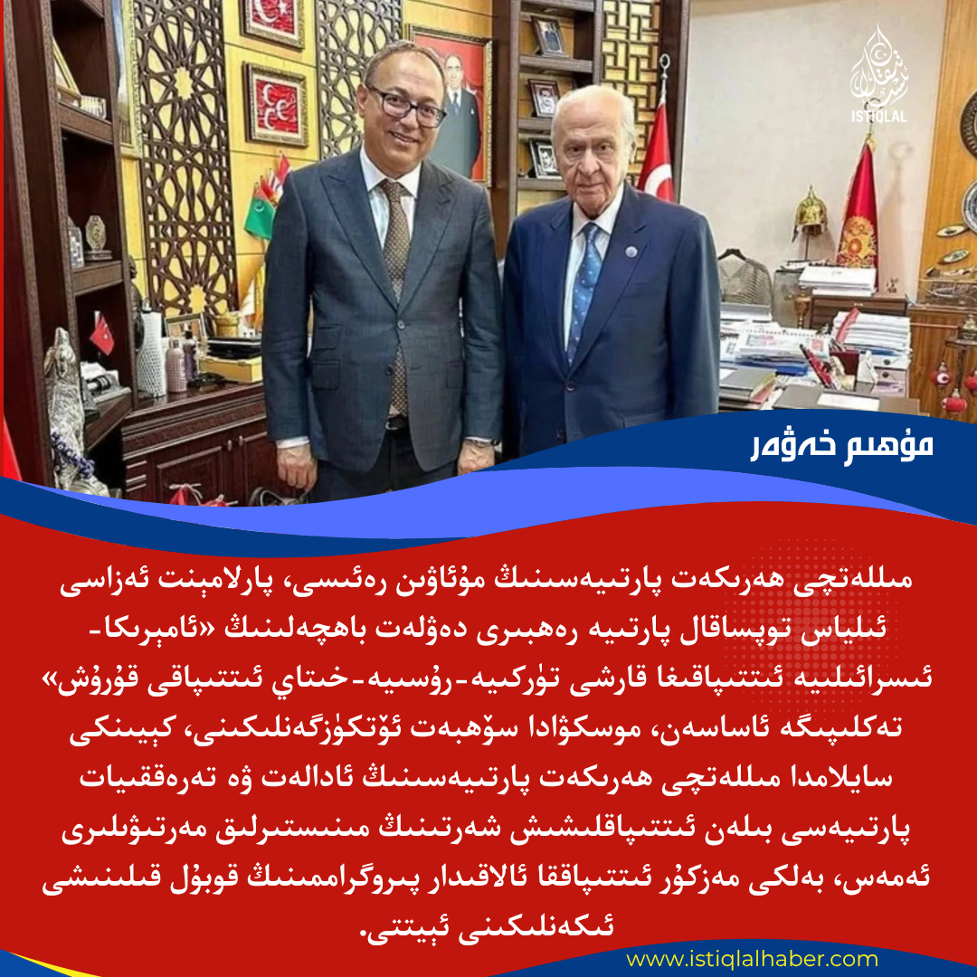 مىللەتچى ھەرىكەت پارتىيەسىنىڭ مۇئاۋىن رەئىسى، پارلامېنت ئەزاسى ئىلياس توپساقال پارتىيە رەھبىرى دەۋلەت باھچەلىنىڭ «ئامېرىكا-ئىسرائىلىيە ئىتتىپاقىغا قارشى تۈركىيە-رۇسىيە-خىتاي ئىتتىپاقى قۇرۇش» تەكلىپىگە ئاساسەن، موسكۋادا سۆھبەت ئۆتكۈزگەنلىكىنى، كېيىنكى سايلامدا مىللەتچى ھەرىكەت پارتىيەسىنىڭ ئادالەت ۋە تەرەققىيات پارتىيەسى بىلەن ئىتتىپاقلىشىش شەرتىنىڭ مىنىستىرلىق مەرتىۋىلىرى ئەمەس، بەلكى مەزكۇر ئىتتىپاققا ئالاقىدار پىروگراممىنىڭ قوبۇل قىلىنىشى ئىكەنلىكىنى ئېيتتى.