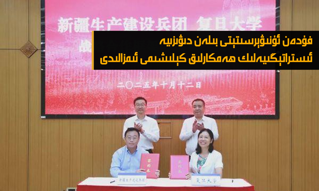 خىتاي رېجىمى ئاتالمىش «ئىشلەپچىقىرىش-قۇرۇلۇش دىۋىزىيەسى»نىڭ شەرقىي تۈركىستاننى كونترول قىلىشتىكى رولىنى ۋە ئۇنى يەرلىك بىلەن بىرلەشتۈرۈشنى تەكىتلەۋاتقان بىر ۋەزىيەتتە، خىتاينىڭ داڭلىق ئۇنىۋېرسىتېتلىرىدىن بىرى بولغان فۇدەن ئۇنىۋېرسىتېتى شەرقىي تۈركىستاندىكى «ئىشلەپچىقىرىش، قۇرۇلۇش دىۋىزىيەسى» بىلەن ئىستراتېگىيەلىك ھەمكارلىق كېلىشىمى ئىمزالىدى.